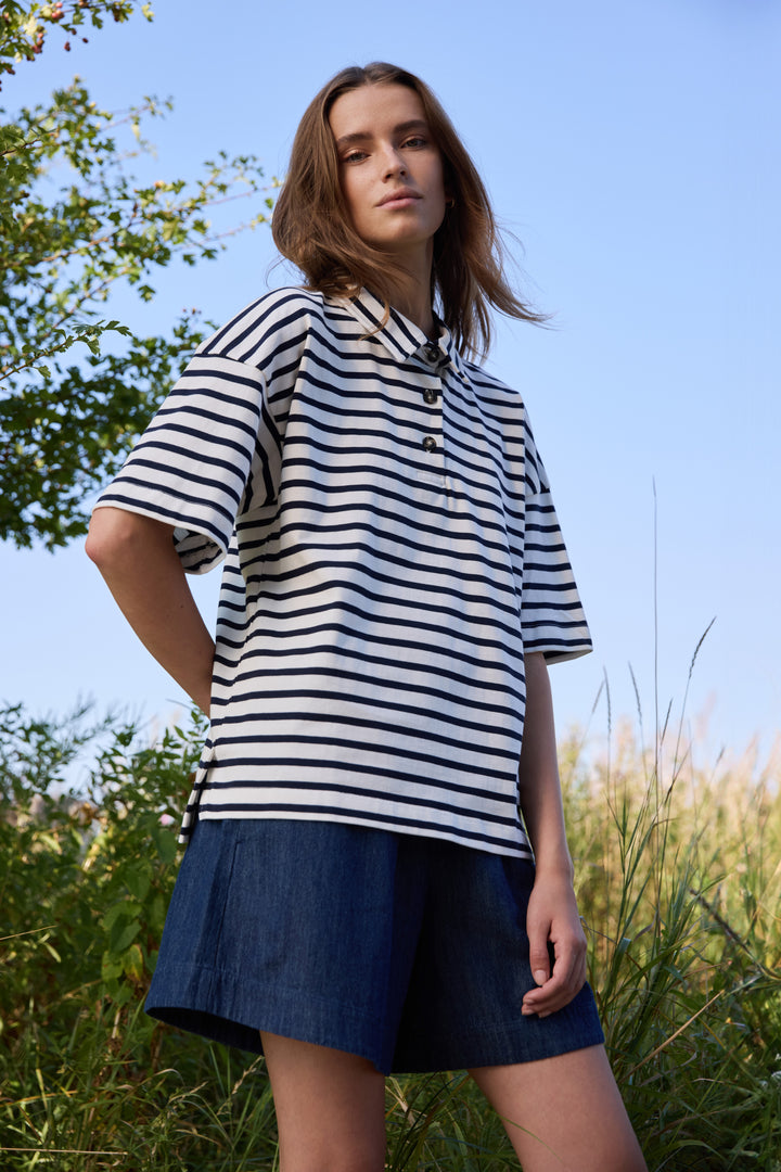 Erun T-shirt er en klassisk poloshirt med korte ærmer og en afslappet, boxy pasform. Designet med sænkede skuldre og slidser i siderne for et moderne touch.