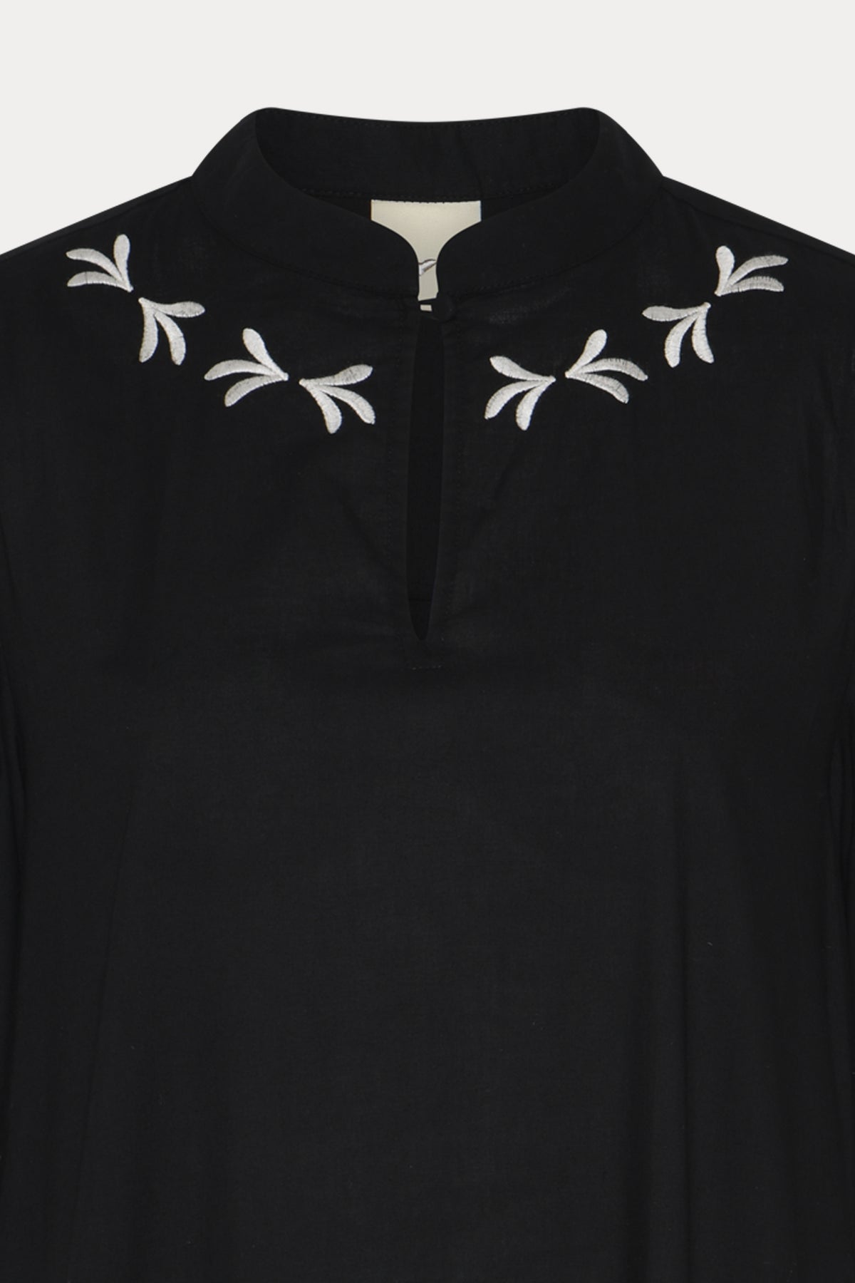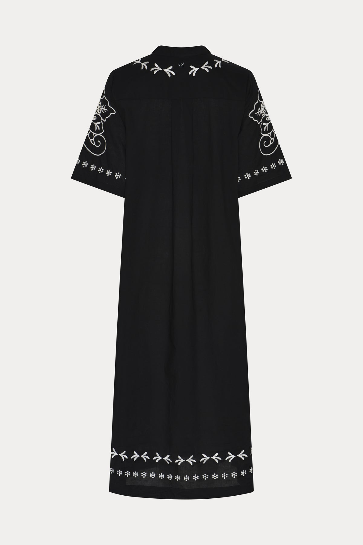 466HMHanna kjole er en lang, lige kjole med stående krave, korte brede ærmer og kontrastbroderier, der giver et roligt, grafisk udtryk.