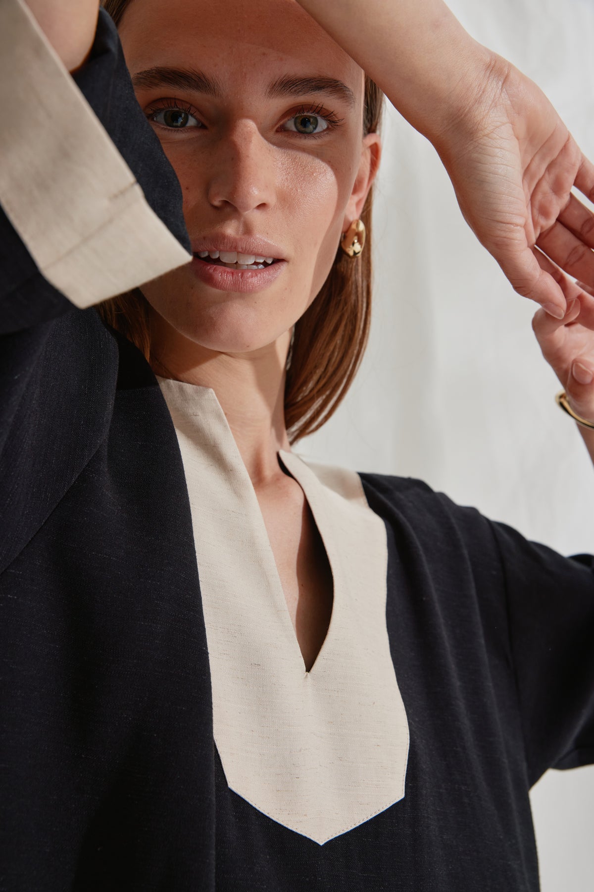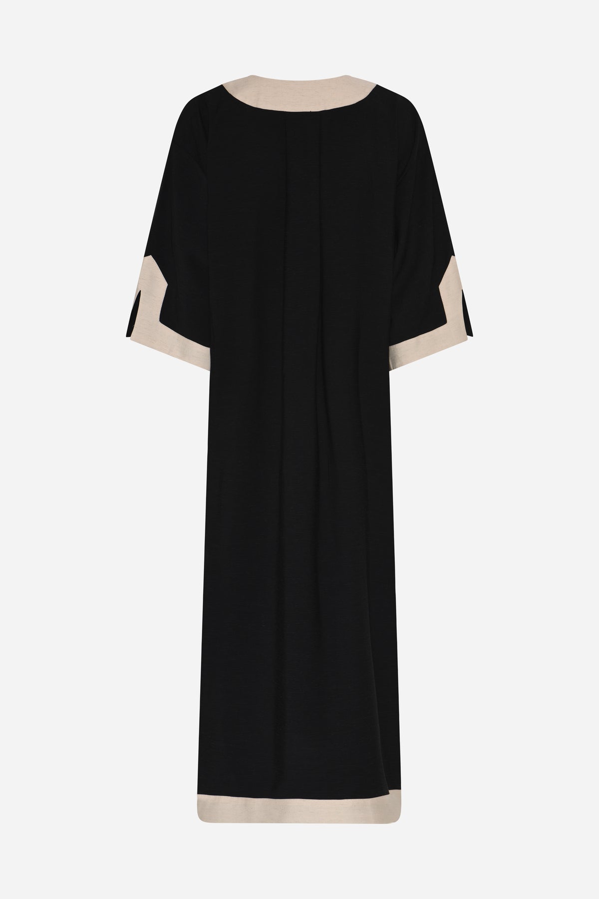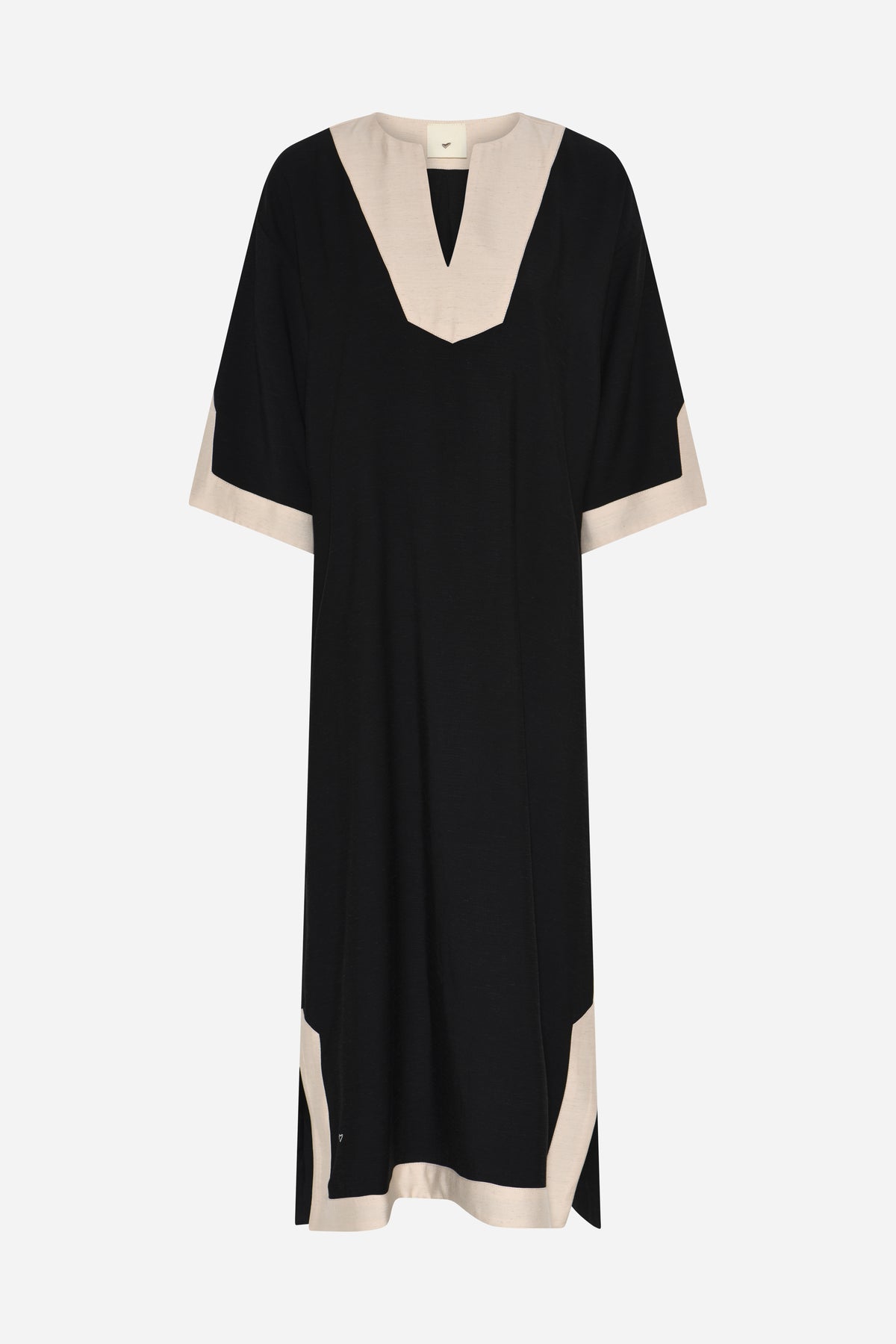 510HMVigdis kjole er en lang kjole med kontrastkant, dyb V-udskæring og en løs, afrundet silhuet, der giver et roligt, skulpturelt udtryk.