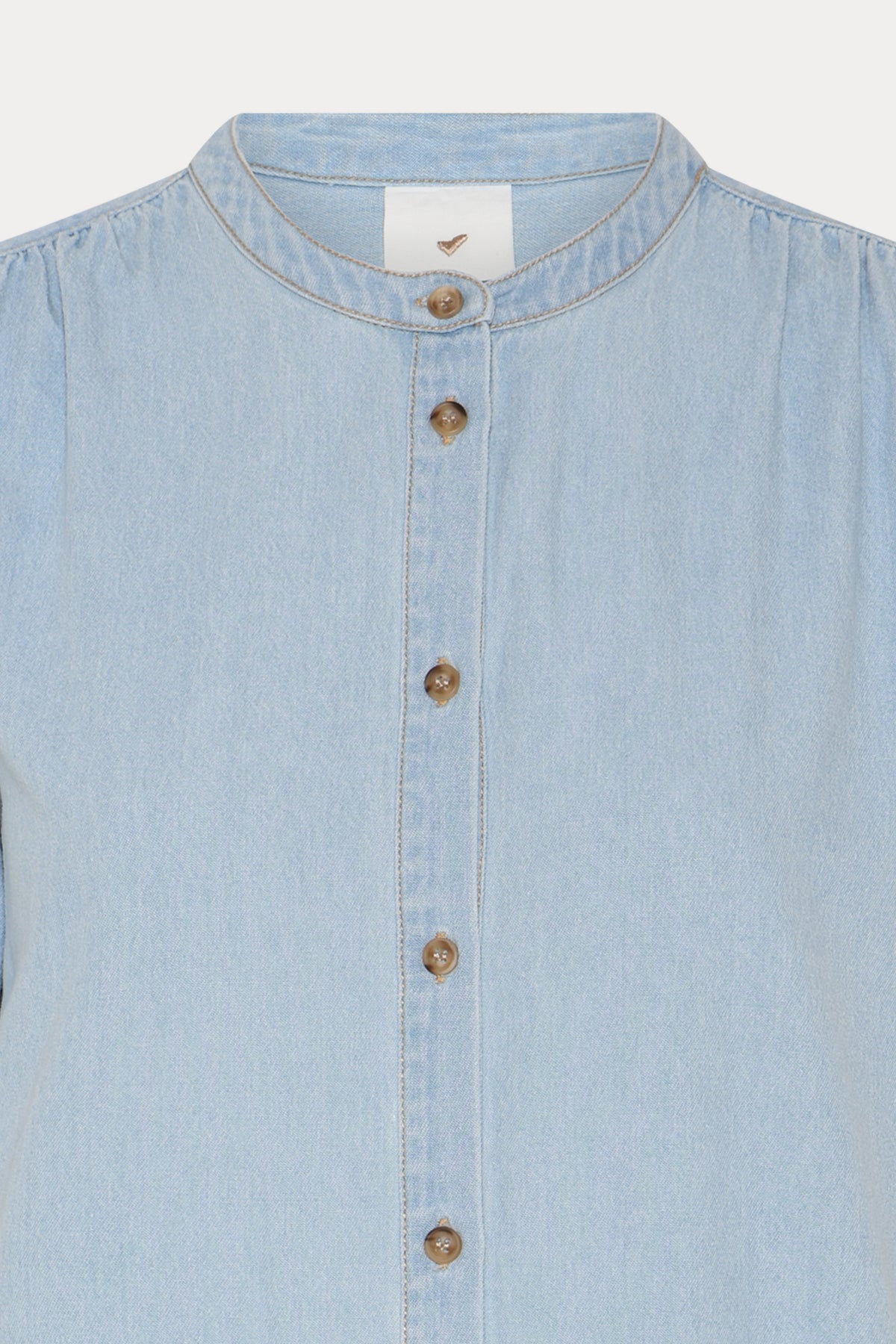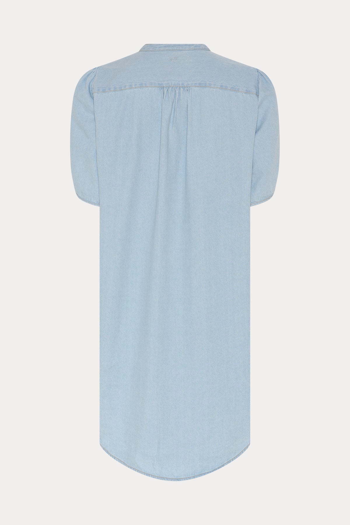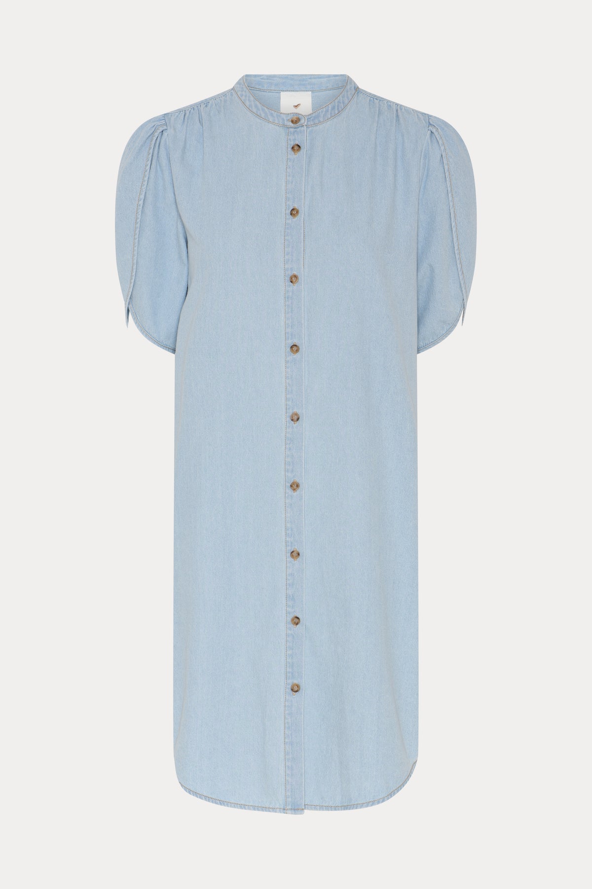 469HMHerle kjole er en lige, knælang denimkjole med stående krave, afrundede skuldre og korte pufærmer, der giver et blødt, struktureret udtryk.