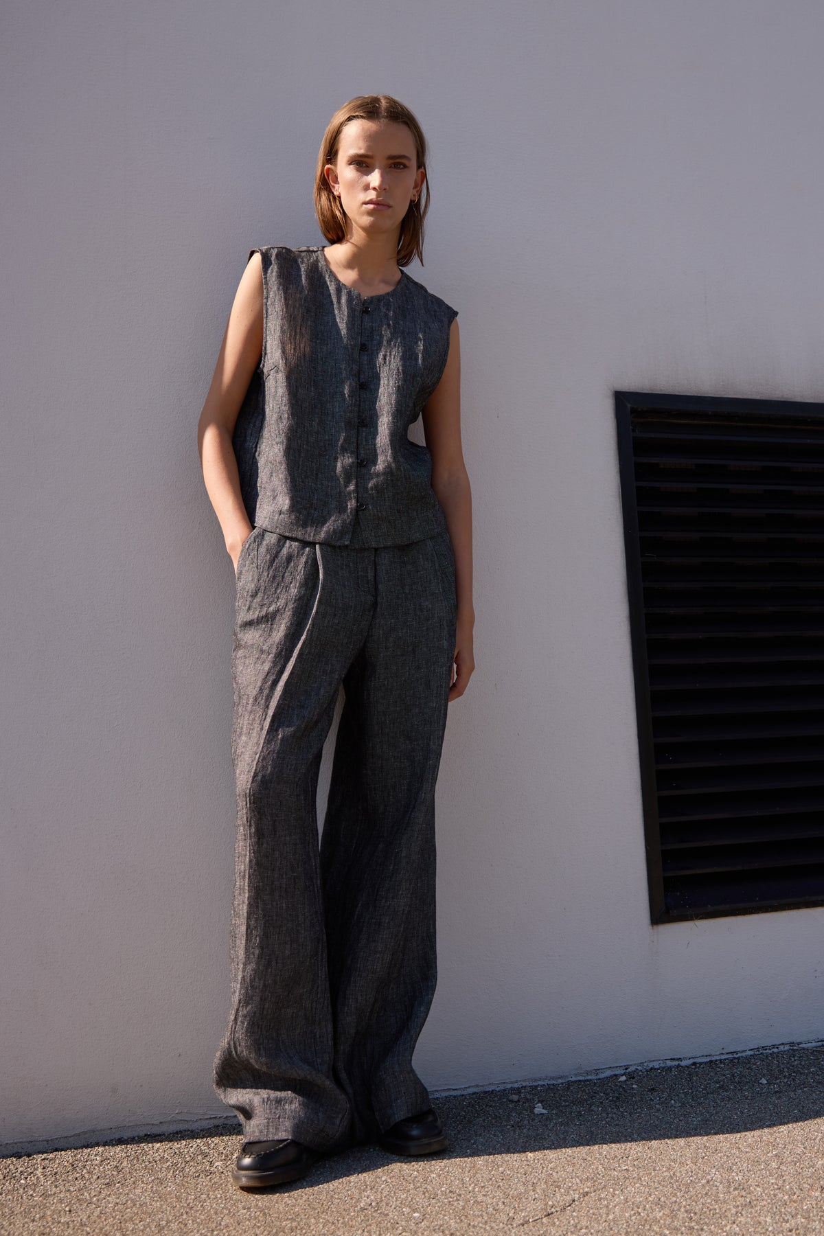 - Loose fit - High waist - Press folds on the front and back - Tailored waistband with belt loops