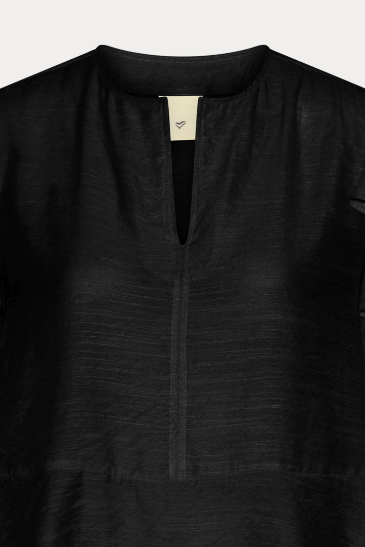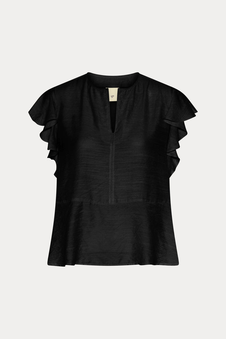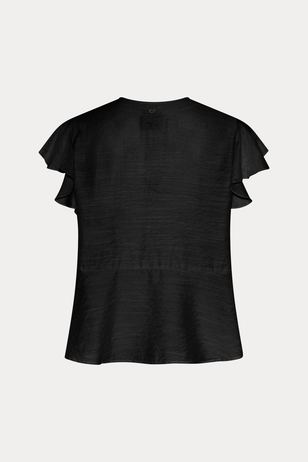 HM512Tuea is a feminine top in lightweight fabric with fluttering ruffle sleeves, a flattering A-line silhouette and elegant keyhole neckline at the front.