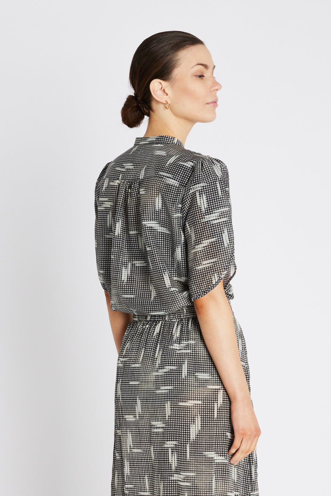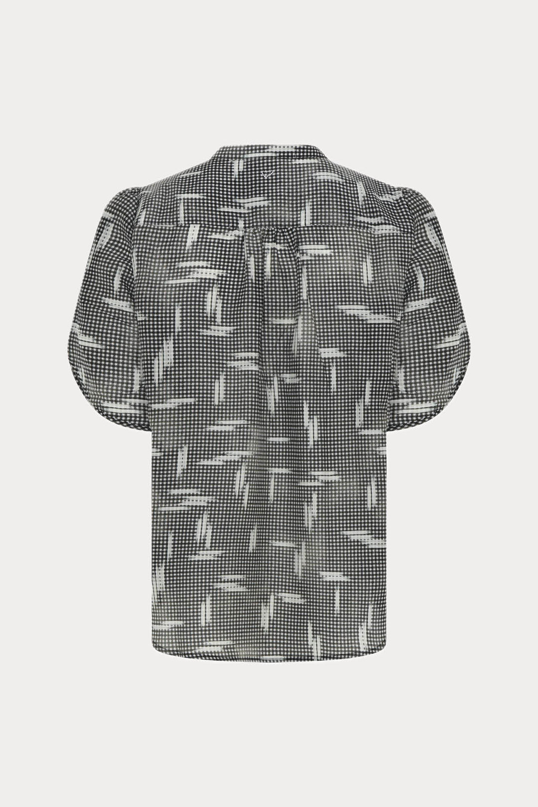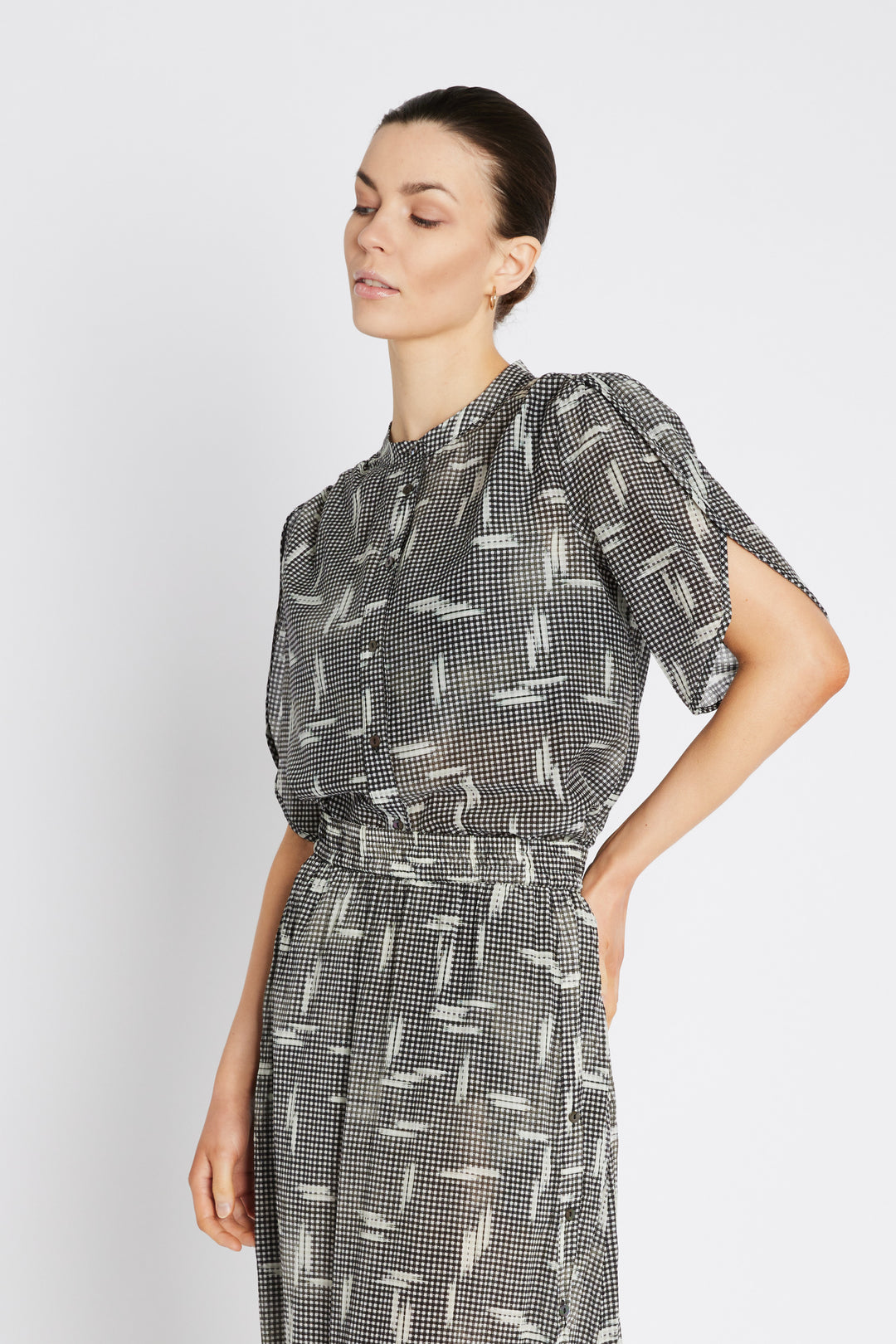 HM620Tulin toppen har et feminint udtryk med fine rynkedetaljer ved ryg og skuldre, der skaber et let og elegant fald.