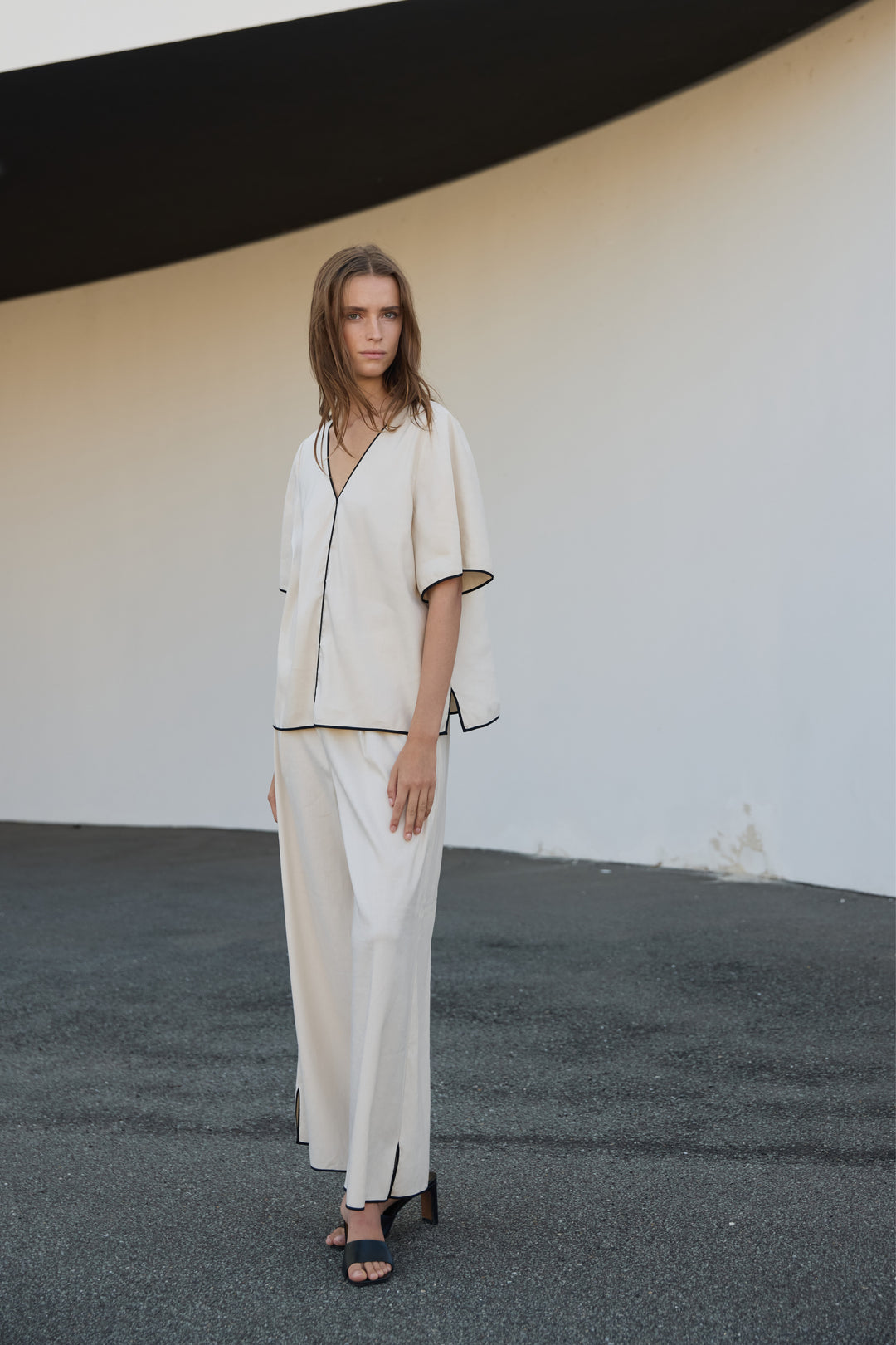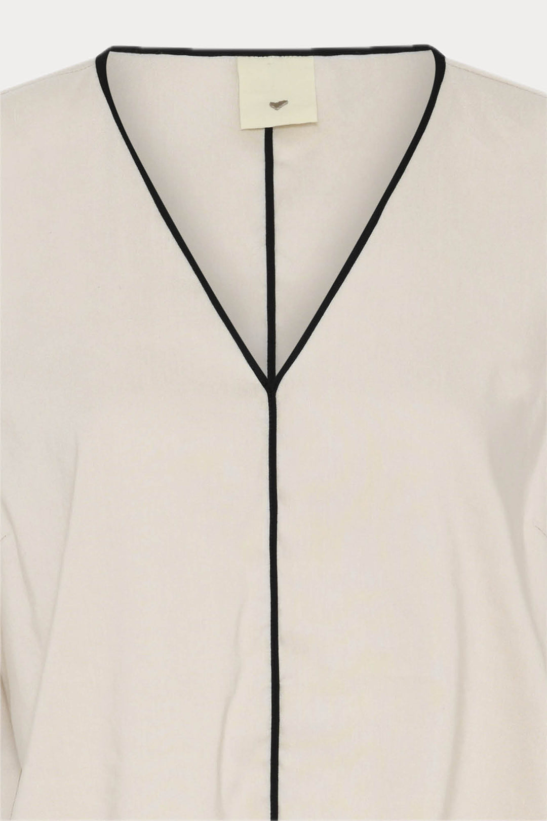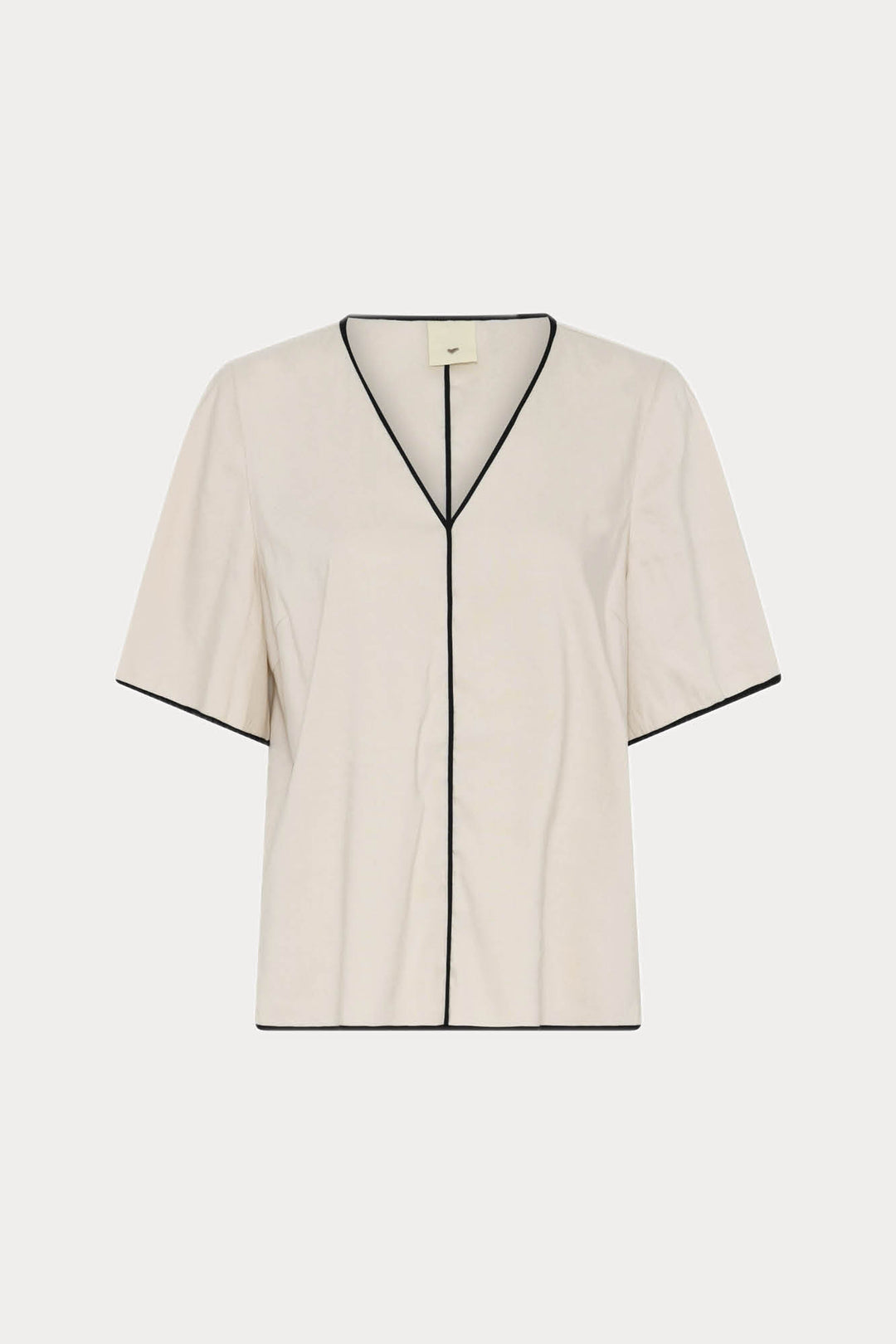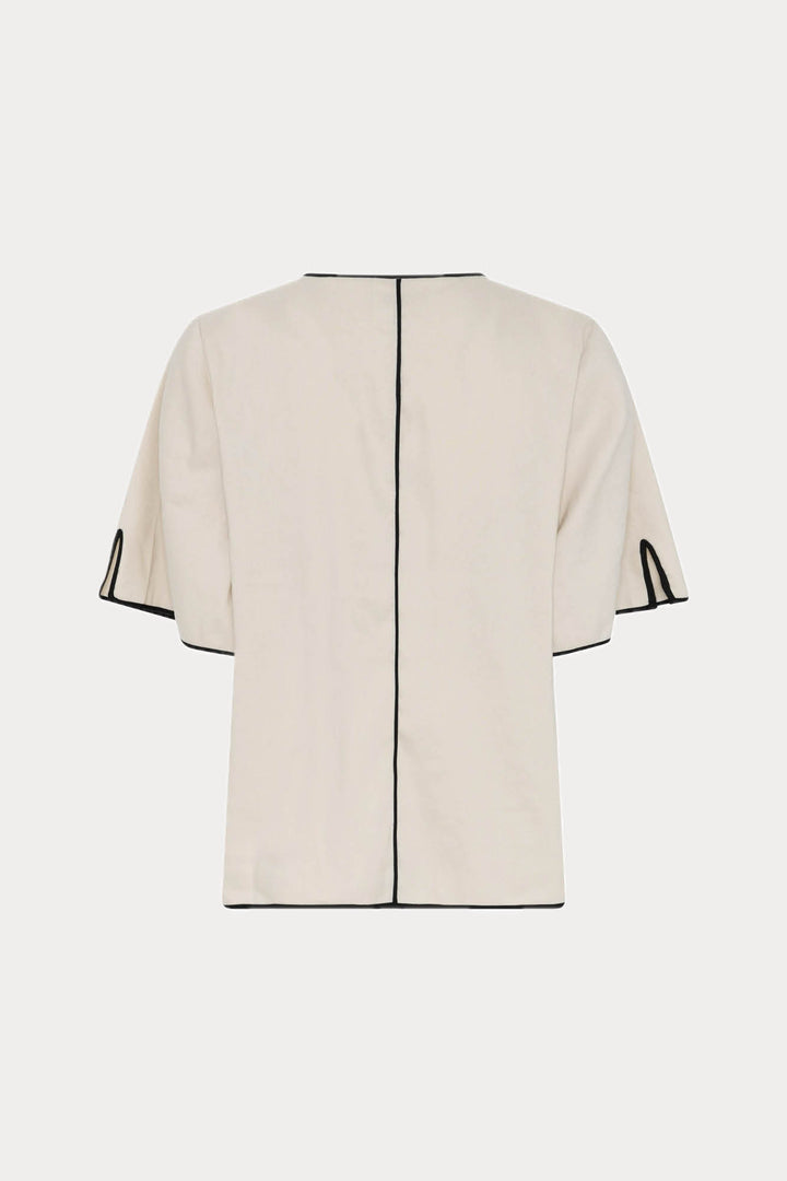 HM411Trida er en elegant, kortærmet top i en let kvalitet med V-udskæring og sorte kontrastkanter, der fremhæver det sofistikerede snit.